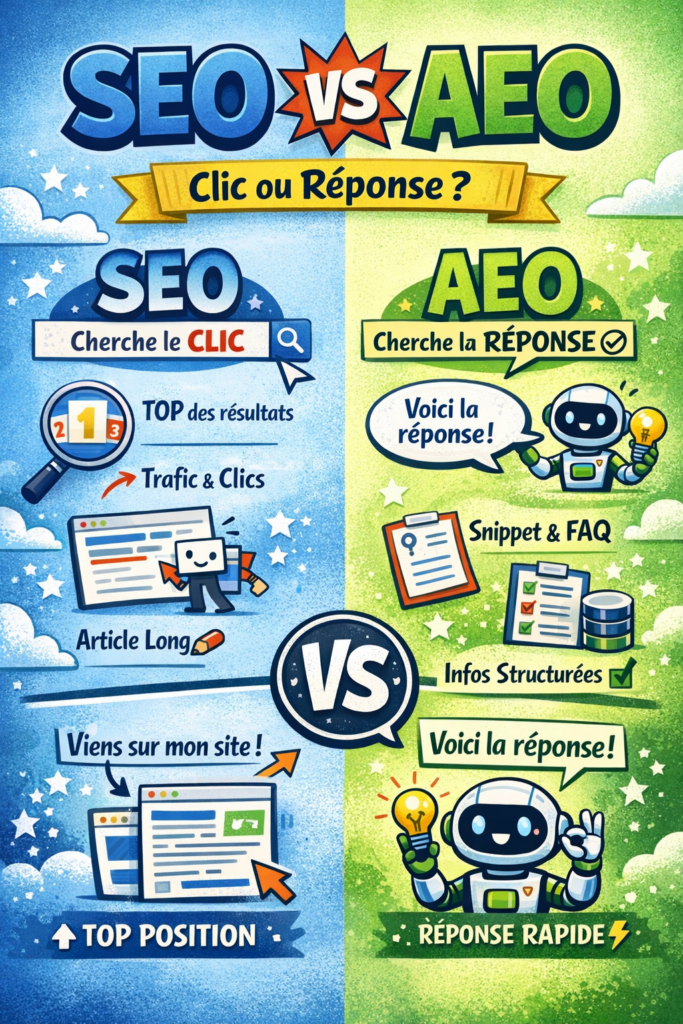 Comprenez la différence entre SEO et AEO : clic vs réponse. Découvrez une méthode simple, une checklist et une FAQ pour optimiser votre contenu en 2026.